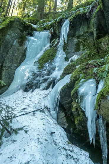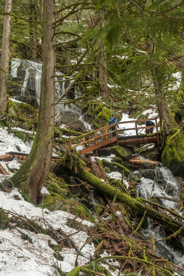 Back on the Dragon's Back trail. This time the snow made us park lower, just past the short gravel road leading up to the trailhead. This added only about 15 minutes of snowshoeing. Because of the ice and wet snow, we had to take our time on the steep slopes and stairs. I have another more detailed blog of this trail from March 24, 2021.