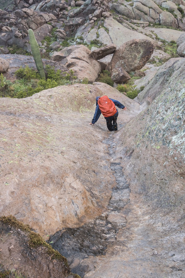 I ended up going to the left more, down a very narrow gully from which I had to let myself drop at the bottom. The others weren't so keen on doing that, so they stayed more to the right, on the rounded and steep smooth bedrock.