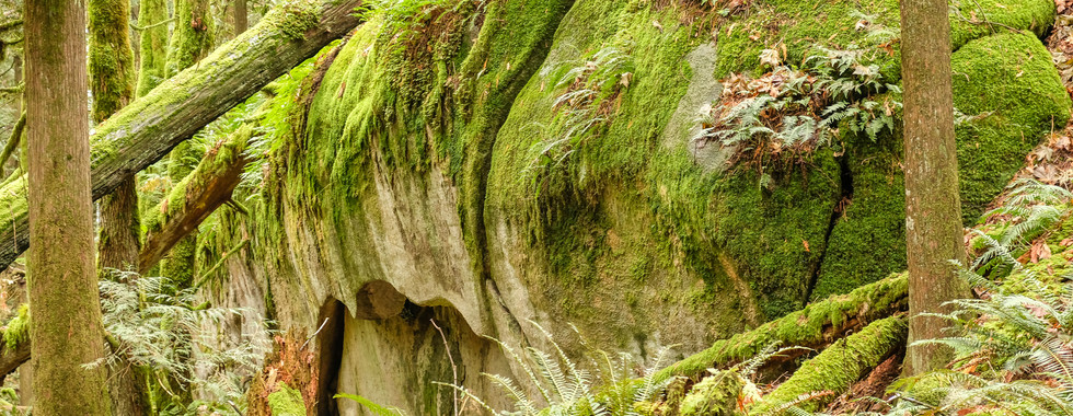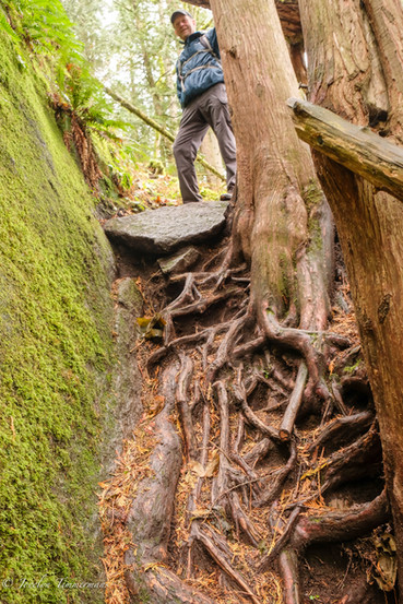 This is the trail to Campbell Lake. But we turned back at the viewpoint as the clouds remained low, totally obscuring any views to be had. At that point we'd done most of the elevation gain to the lake which would've been another half hour walk. The outstanding feature about this steep hike is the truck-size moss-covered boulders.