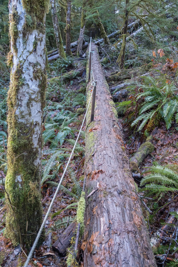 After walking 900m on an almost level FSR, we turned right, and minutes after crossing some cut-block we got to the top of an almost vertical slope. Without the ropes it would not have been possible to descend the wet slippery path.