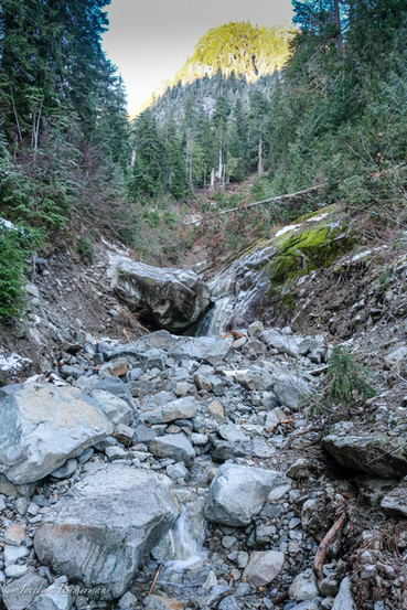 At the end of the FSR the trail narrowed and led steeply upwards to the top of the falls. The ground beyond this fallen tree became quite frosty. So on the decent we kept our micro-spikes on till this point.