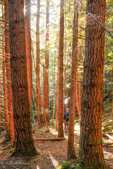 FSR roads run parallel to this trail. So why take the trail? Because then you can smell the fallen foliage, and shuffle through the bronze, gold and bright yellow maple leaves and see the sun beams reaching through tall trees. And the various toadstools, bubbling brooks and moss covered benches & bridges that are melding back into the forest. And massive stumps with tell-tale ancient ax-cuts, bird-song and lingering back-lit leaves with their brilliant autumn hues. Walking these trails keeps one more in tune with nature.
