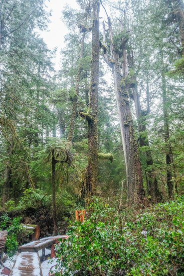 The Rain Forest trail. Ancient tall cedars reaching high into the sky.