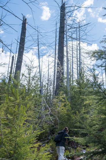 Once on the ridge the few small patches of snow & hoar-frost had melted in the full sun. Scarred trees of the 2004 fire jutted out amidst the young lodgepole pines.